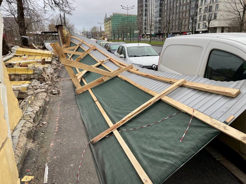 На Лиговском проспекте ветром снесло строительный забор, постройка рухнула на припаркованные машины.