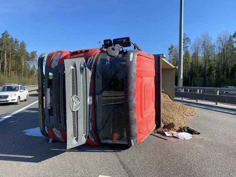 Ожидается, что в ближайшее время к месту аварии прибудет специальная техника, которая поднимет перевернутый автомобиль на колеса и освободит полосы от образовавшейся пробки. После того, как грузовик поднимут, специалисты оперативно сметут рассыпанный песок с трассы.