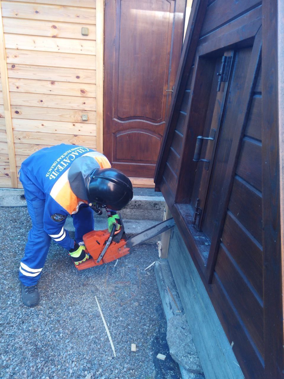 На прикрепленных кадрах видно, как спасатели работают с крытым колодцем, выпиливая бензопилой доски. На снимке можно заметить, что доступ к колодцу закрытый – для того, чтобы набрать воду, нужно открыть дверцу постройки, похожей на небольшую избушку.
