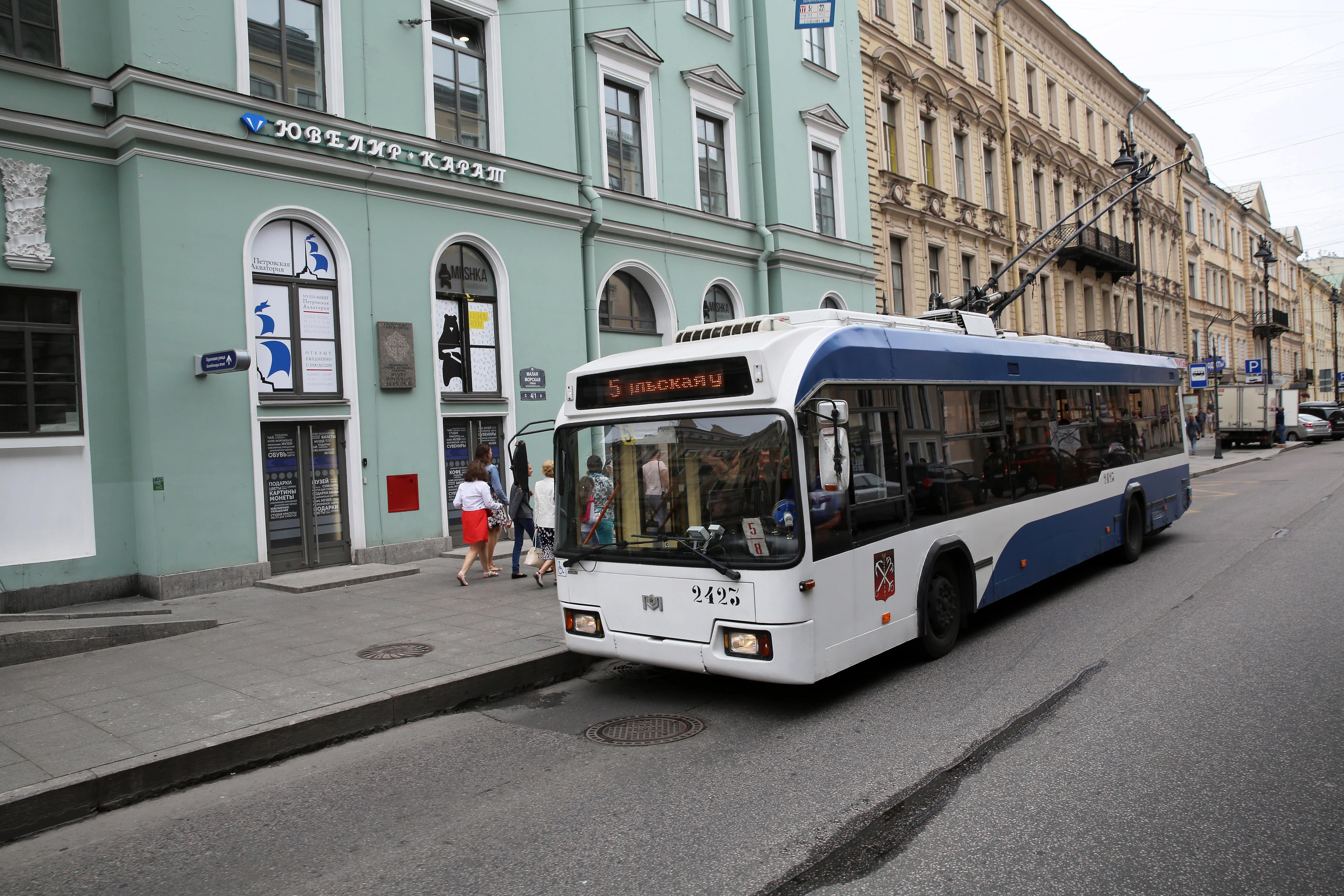 Троллейбус проедется № 5: от к/ст «Улица Маршала Тухачевского» по ул. Маршала Тухачевского, Апрельской ул., пр. Металлистов, Якорной ул., Комаровскому проезду, Большеохтинскому мосту, Тульской ул., Суворовскому пр., Невскому пр., М. Морской ул., Гороховой ул. Обратно транспорт пройдет по Адмиралтейскому пр., Невскому пр.) до к/ст «Адмиралтейский проспект»;
